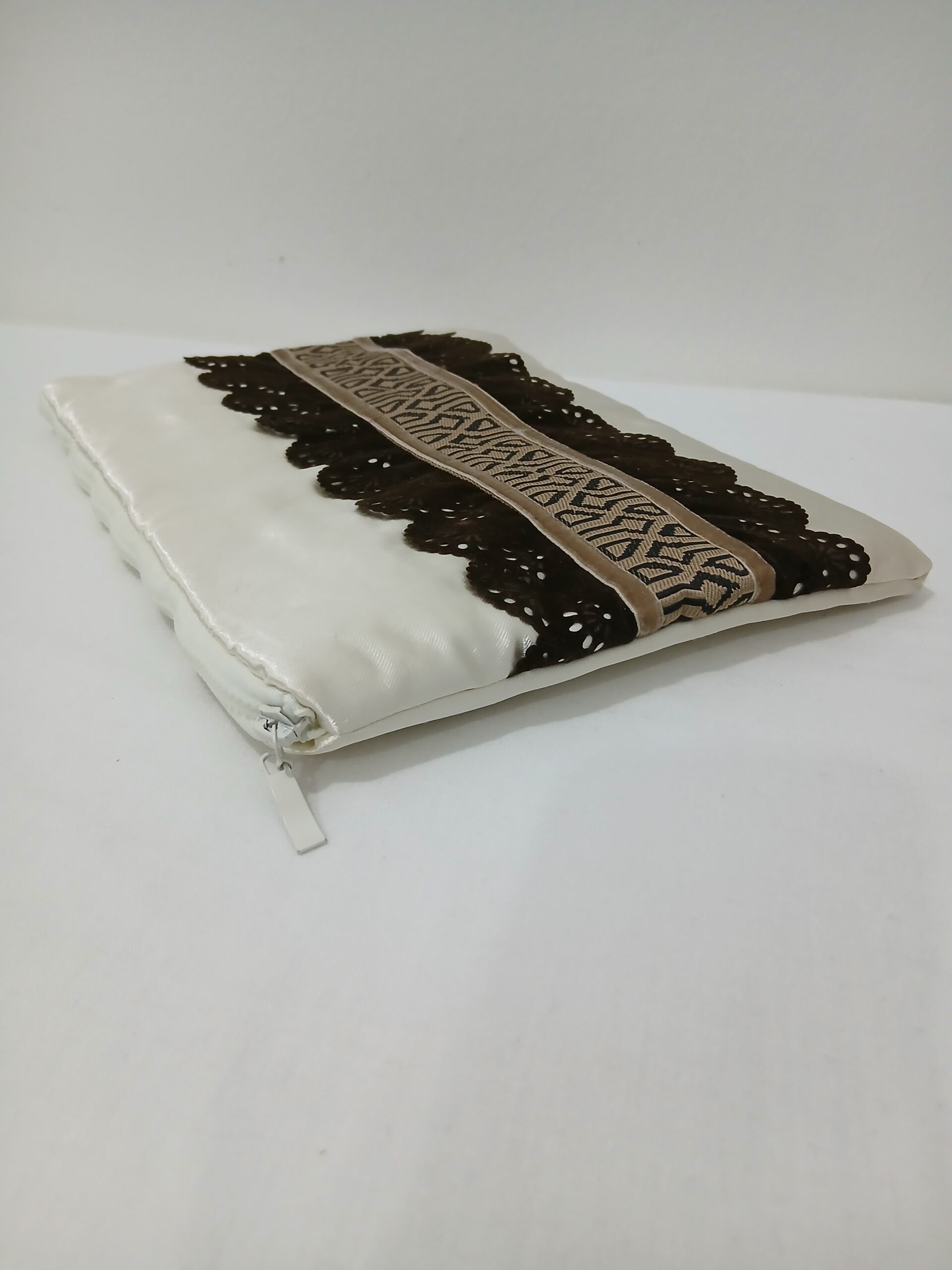 شنطة آيباد من الستان الفاخر باللون الأبيض، بتصميم أنيق وعصري مثالية للمناسبات.